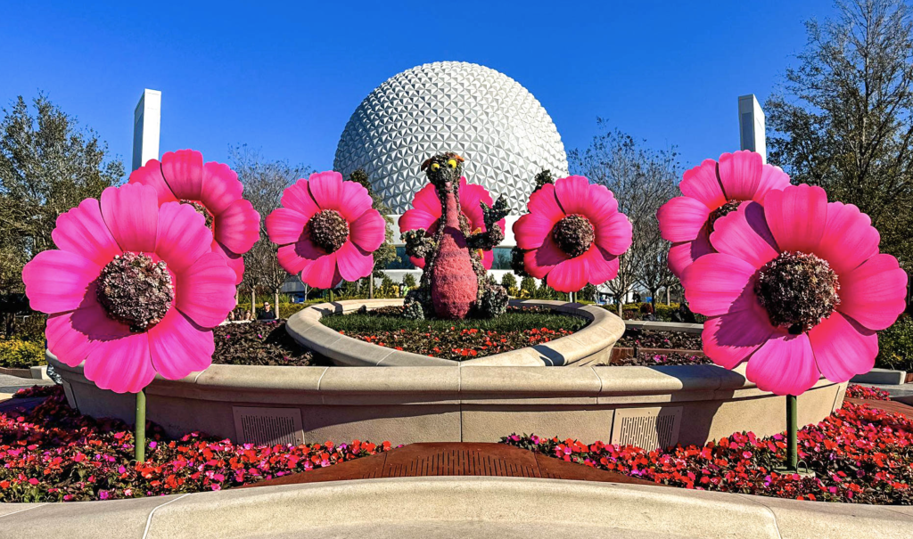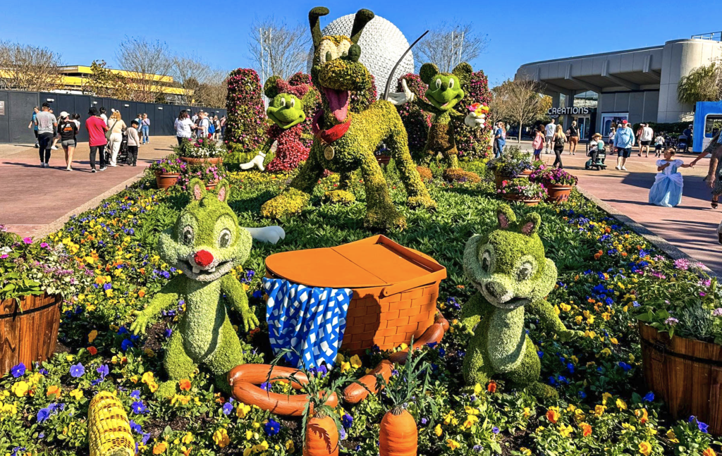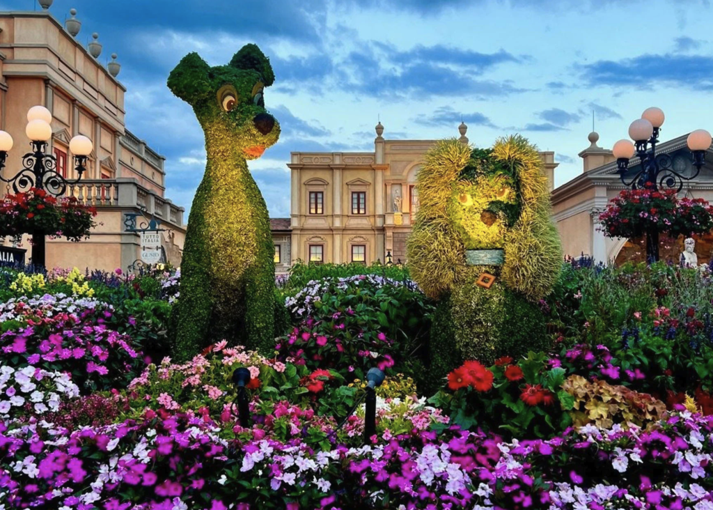 Durante o evento, o parque recebe mais de 30 milhões de flores, espalhadas em jardins temáticos, canteiros coloridos e nas famosas topiárias — esculturas feitas com plantas vivas que ganham forma de personagens da Disney.